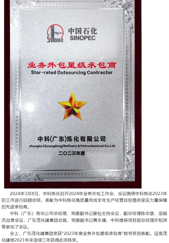 喜報(bào):榮獲中科煉化“2023年度業(yè)務(wù)外包星級(jí)承包商”稱號(hào)