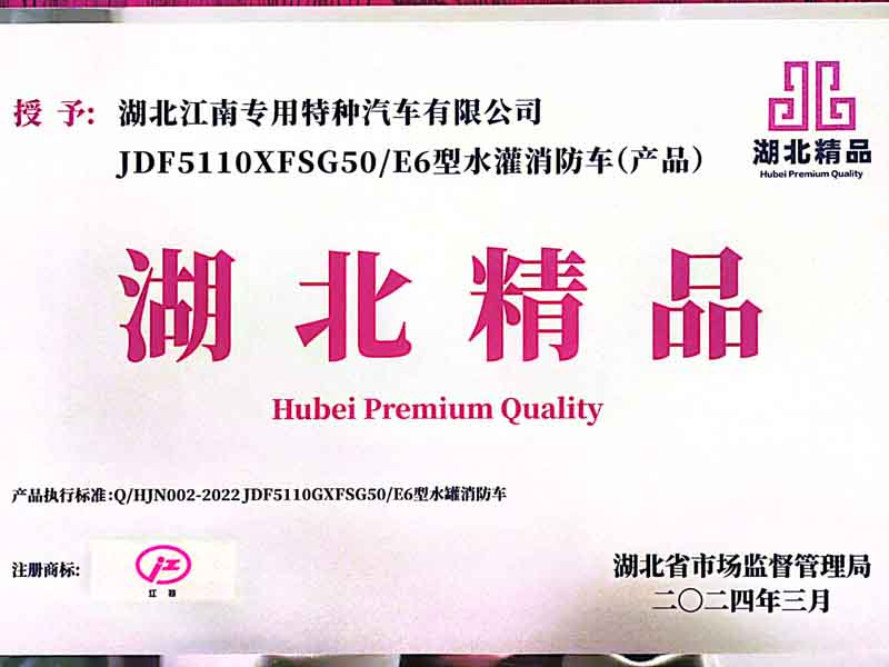 江南JDF5110GXFSG50/E6型水罐消防車獲得“湖北精品”榮譽(yù)稱號